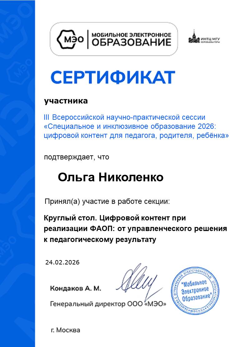 Сертификат участника секции "Круглый стол. Цифровой контент при реализации ФАОП: от управленческого решения к педагогическому результату" 24.02.2026