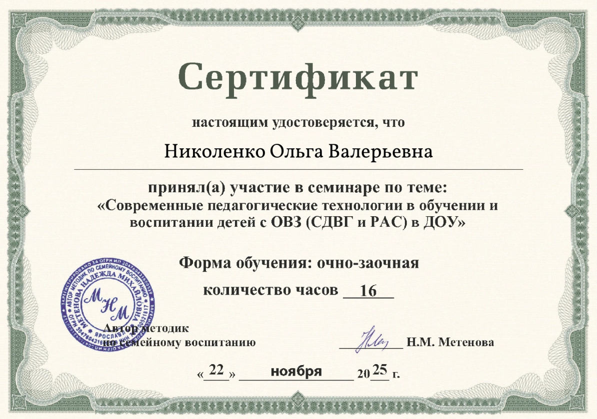 Семинар "Современные педагогические технологии в обучении и воспитании детей с ОВЗ (СДВГ и РАС) в ДОУ" 22.11.2025
