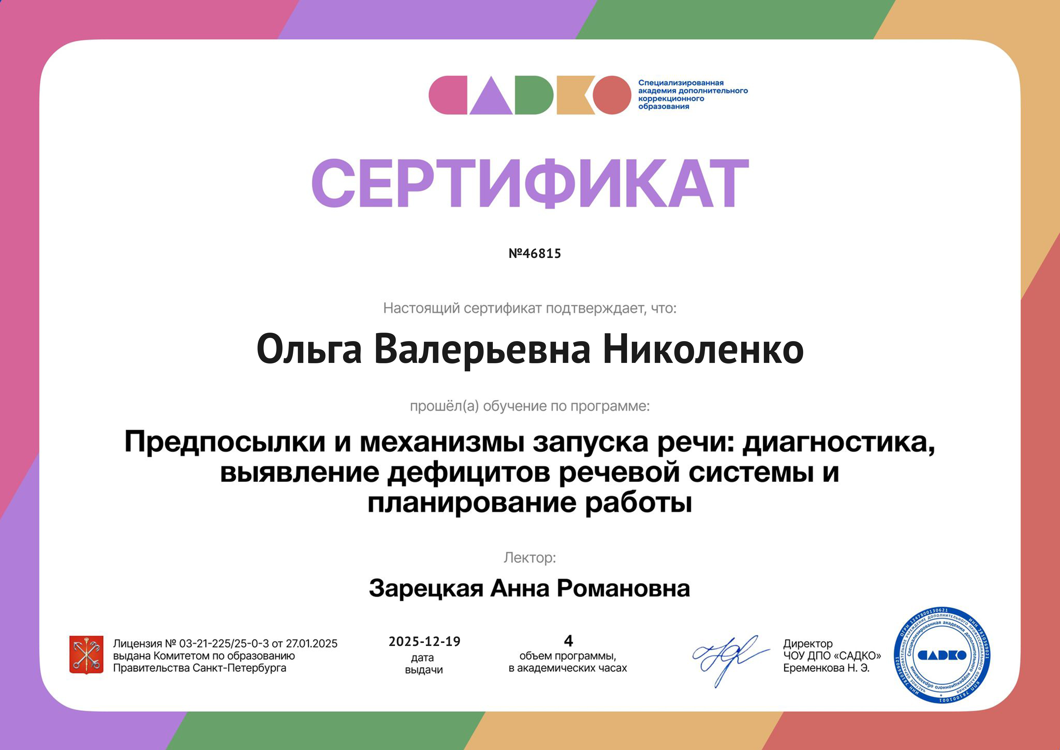 Сертификат обучения по программе "Предпосылки и механизмы запуска речи: диагностика, выявление дефицитов речевой системы и планирование работы" 18.12.2025