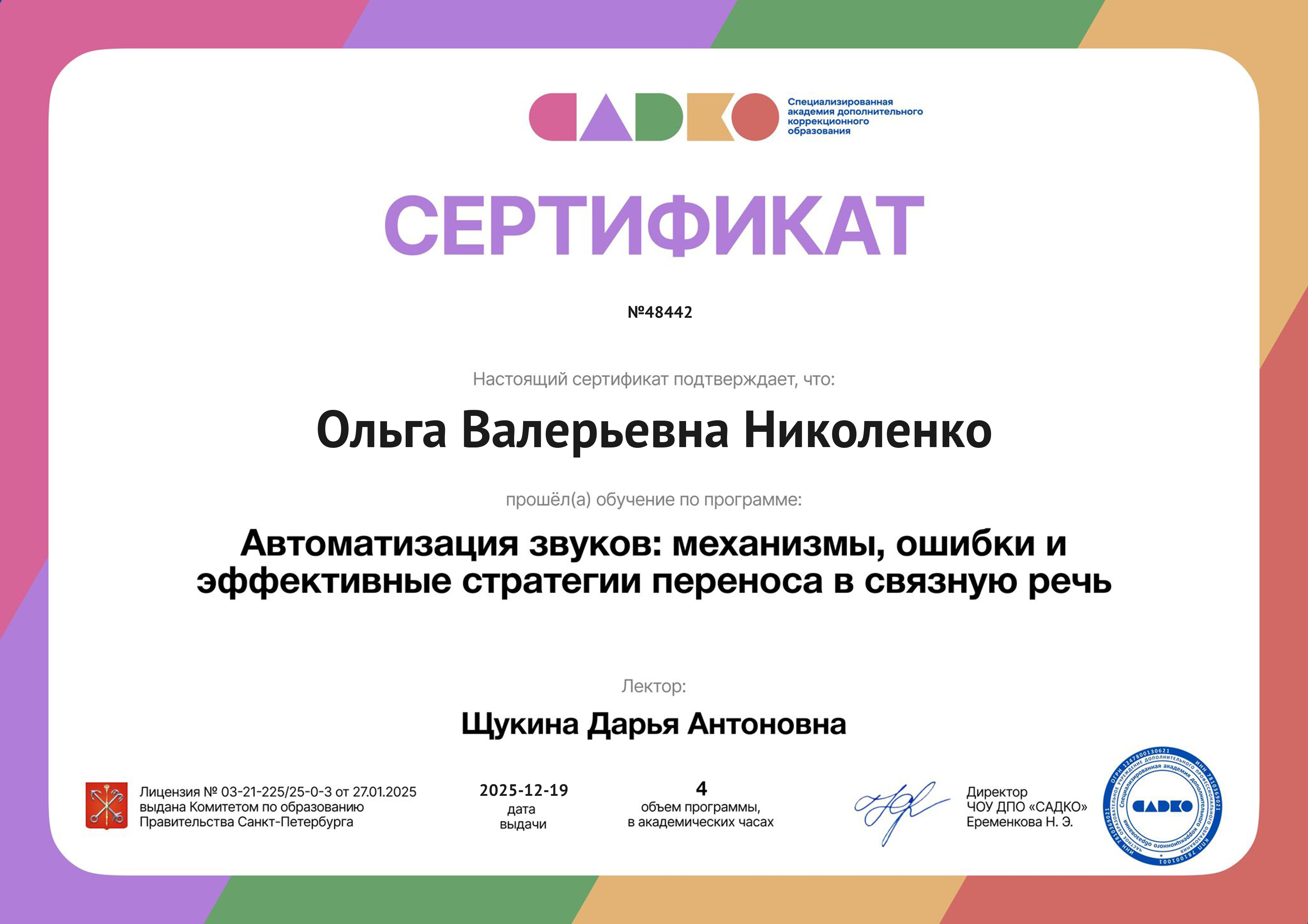 Сертификат обучения по программе "Автоматизация звуков: механизмы, ошибки и эффективные стратегии переноса в связную речь" 17.12.2025