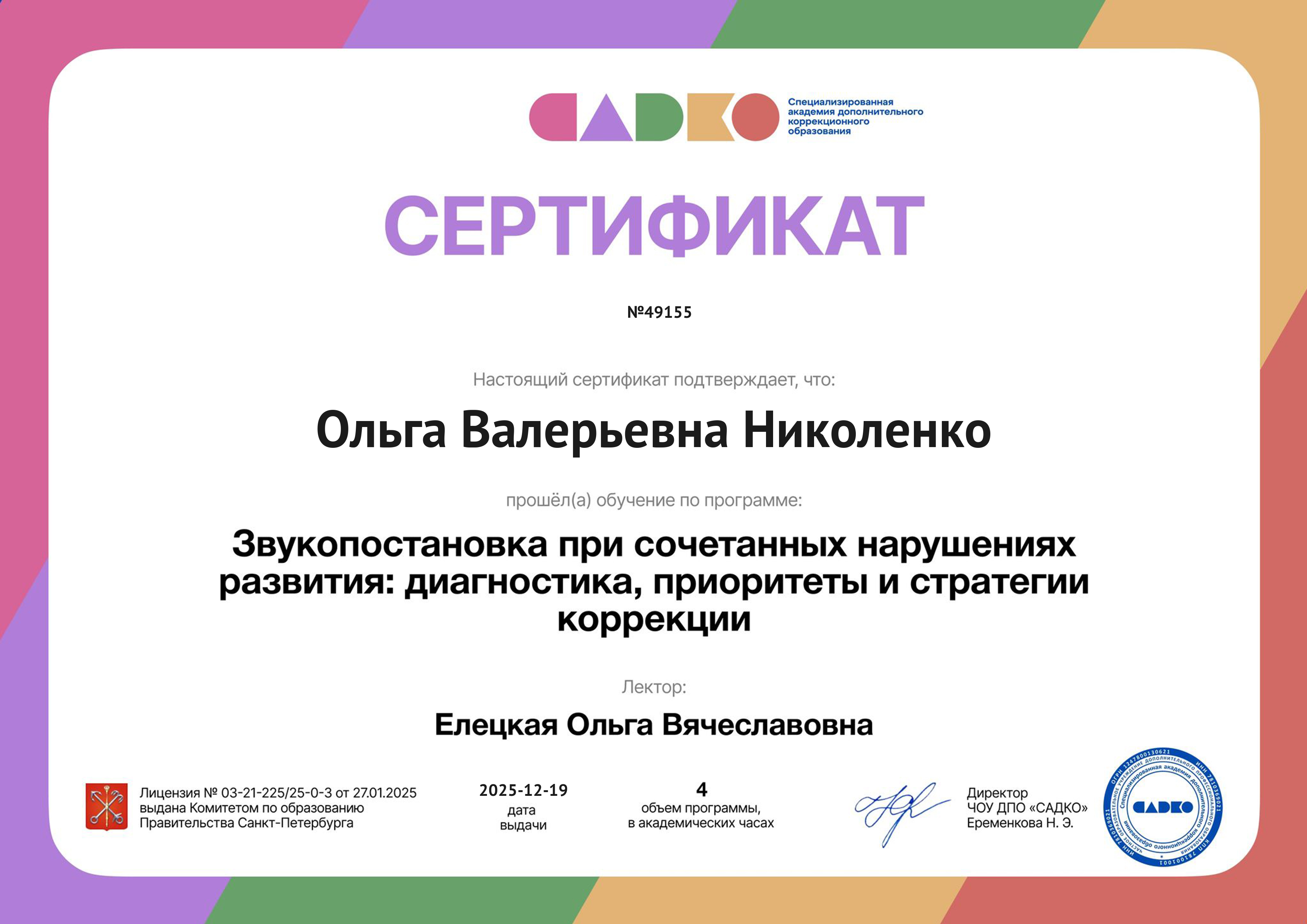 Сертификат обучения по программе "Звукопостановка при сочетанных нарушениях развития: диагностика, приоритеты и стратегии коррекции" 16.12.2025