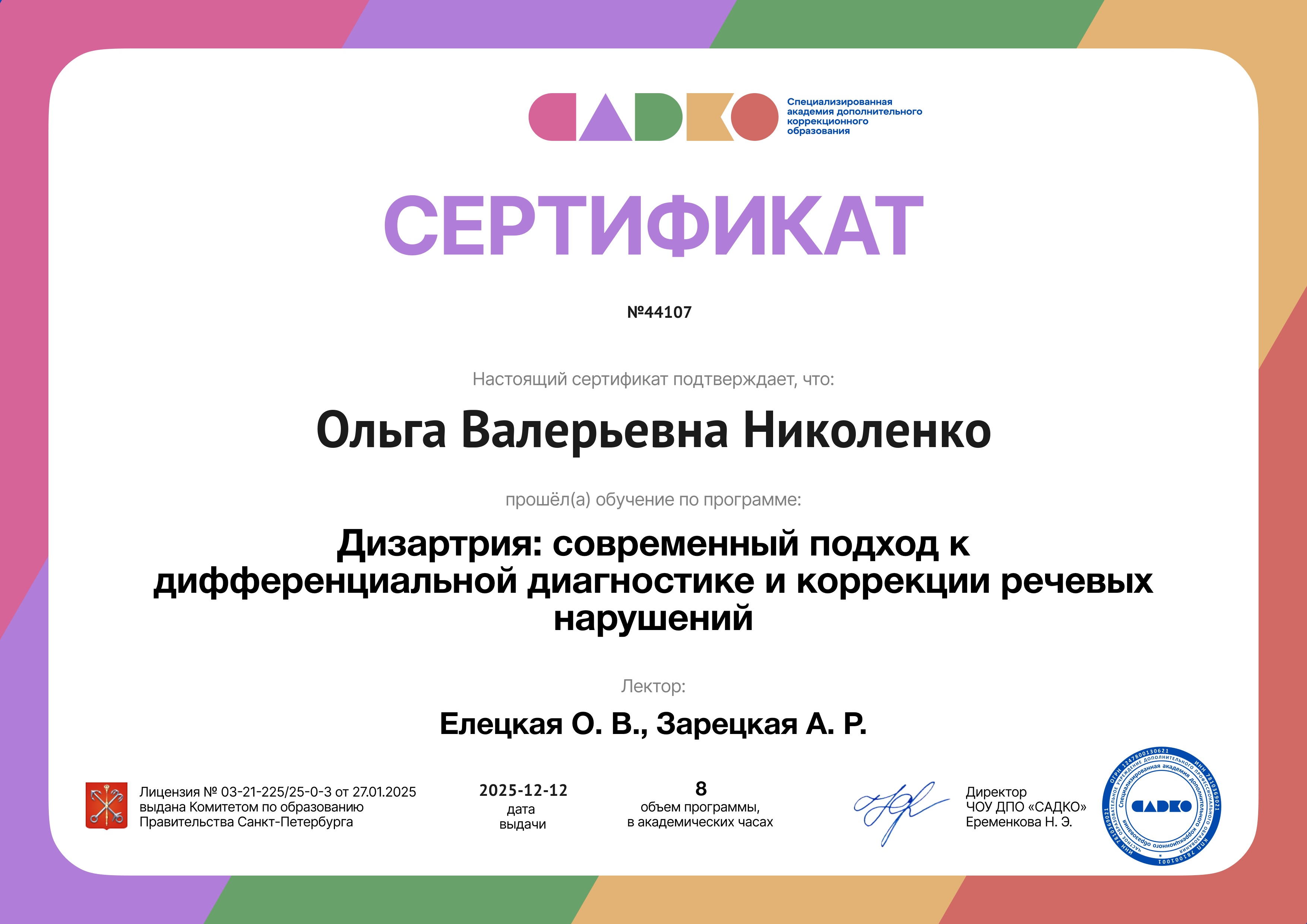 Сертификат обучения по программе "Дизартрия - современный подход к дифференциальной диагностике и коррекции речевых нарушений" 12.12.2025