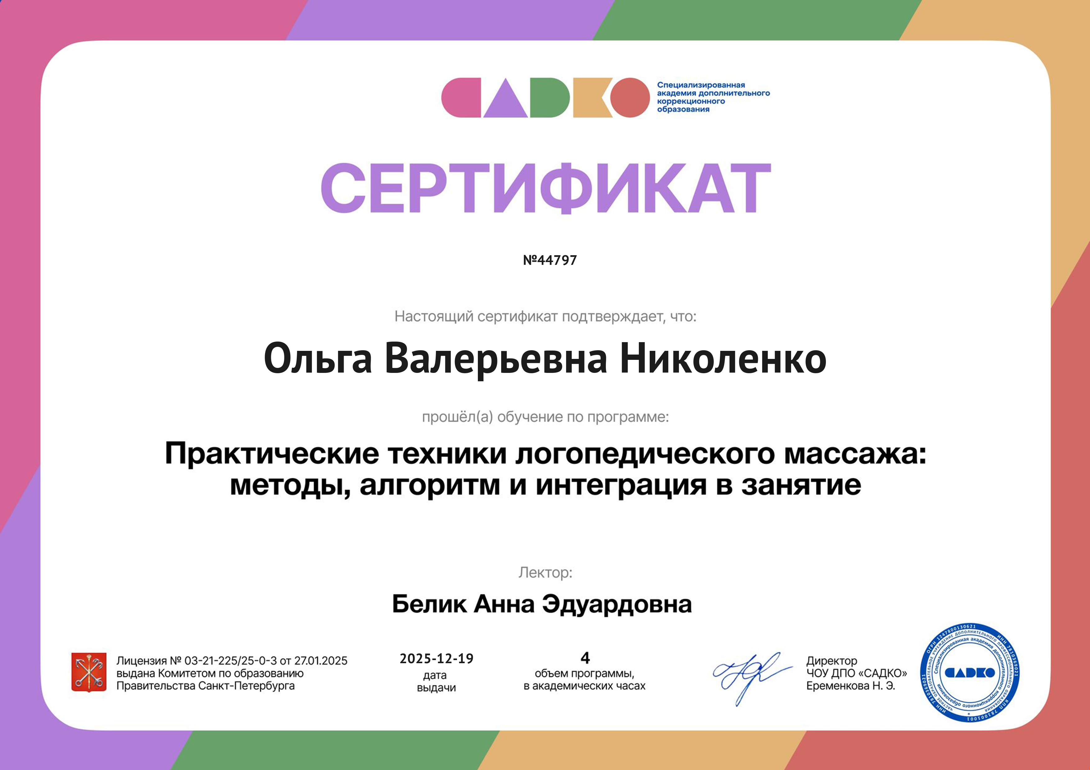 Сертификат обучения по программе "Практические техники логопедического массажа: методы, алгоритм и интеграция в занятие" 19.12.2025