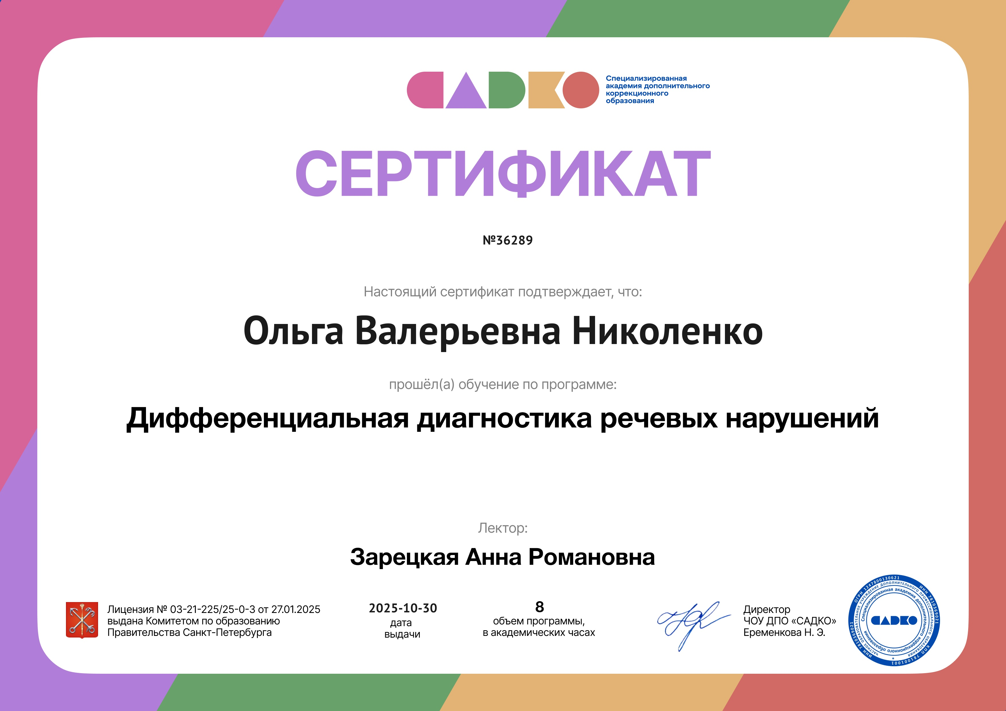 Сертификат обучения по программе "Дифференциальная диагностика речевых нарушений" 30.10.2025