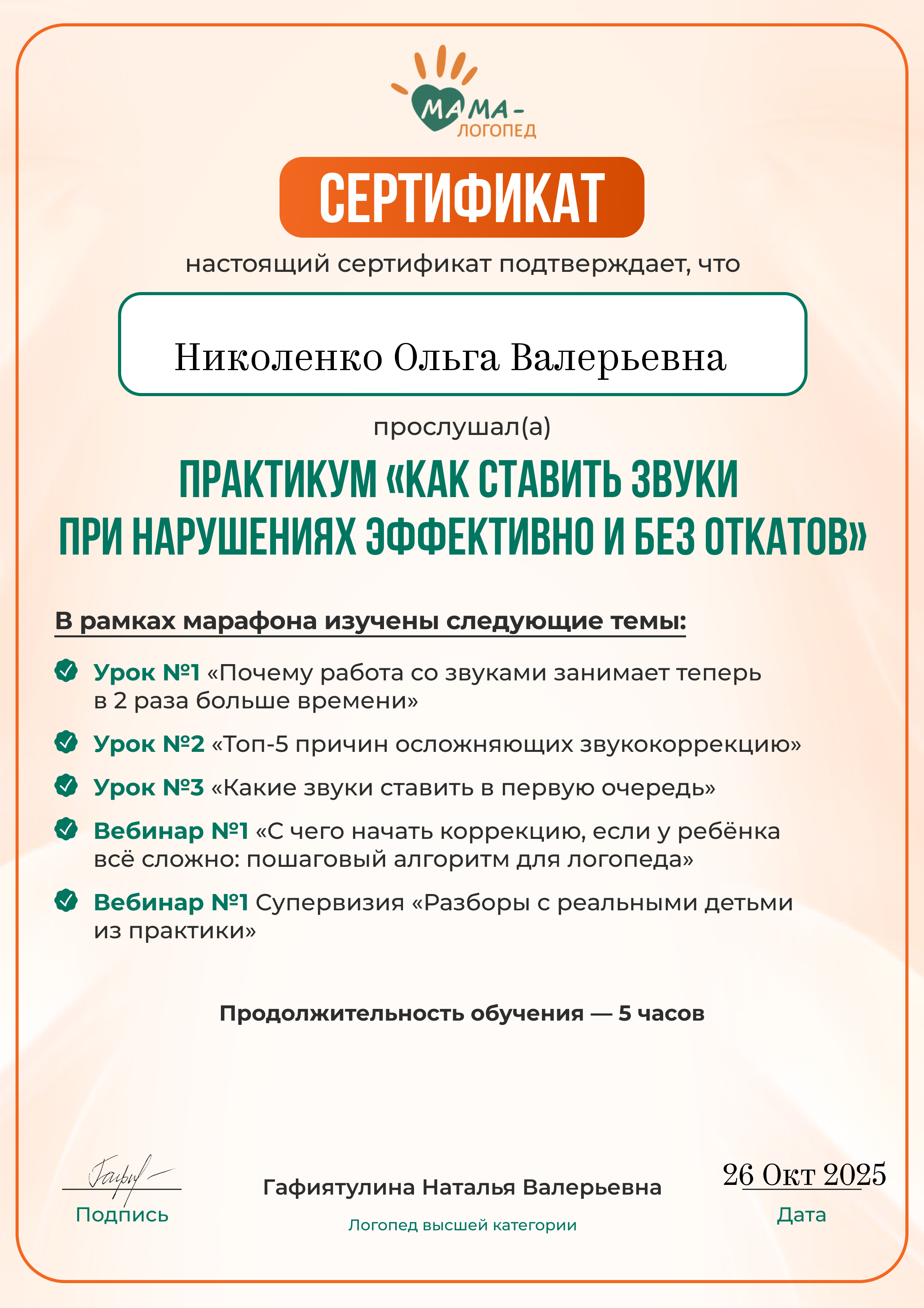 Сертификат участника практикума "Как ставить звуки при нарушениях эффективно и без откатов"  26.10.2025